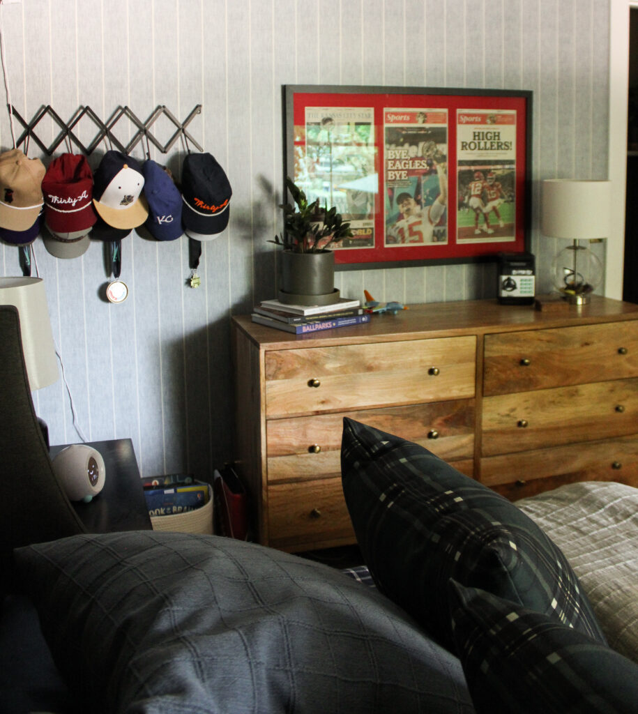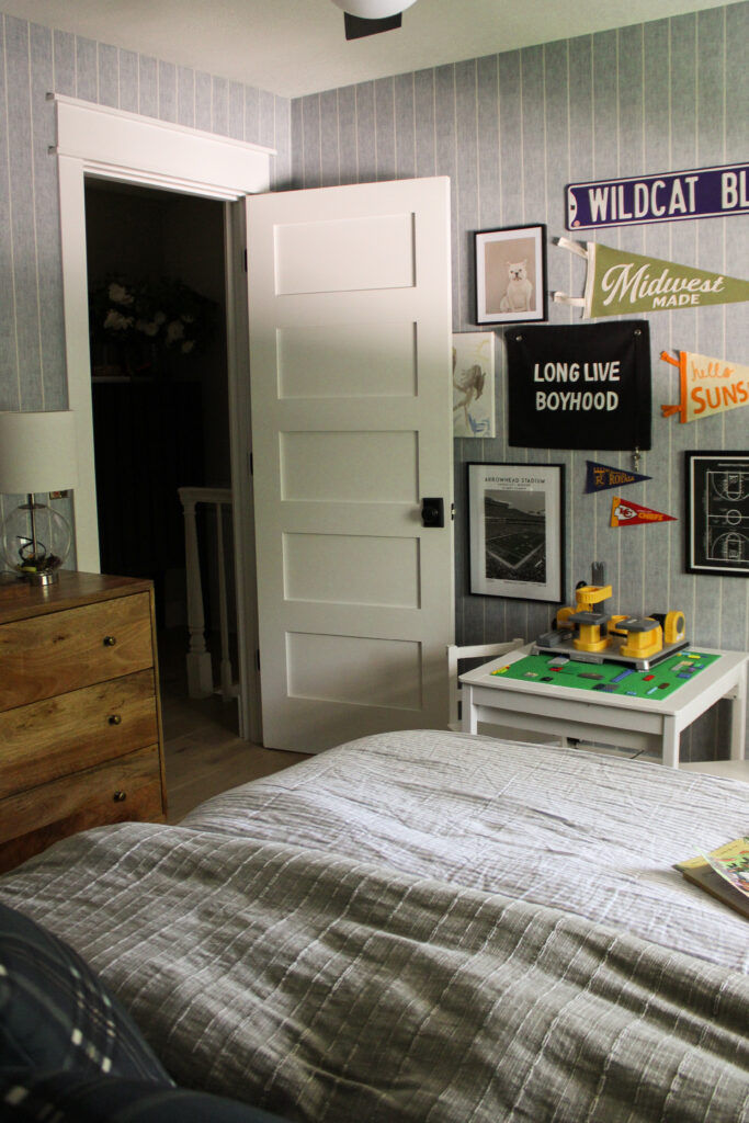 I’ve learned that the key to displaying collections in a boy’s room is to give them structure. That gallery wall of pennants and memorabilia could easily look chaotic, but by keeping the frames consistent and grouping similar items together, it feels curated and intentional.