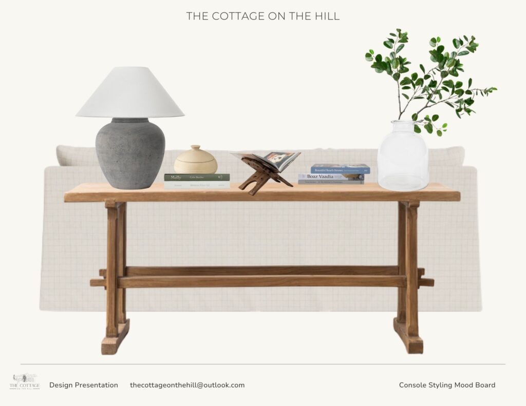 This is where your console becomes truly yours. A small framed photo, a treasured box, a piece of pottery from a trip, a vintage find from an antique store—these are the things that make your space feel personal rather than decorated. Don’t overthink it. If you love it and the scale feels right, it belongs.